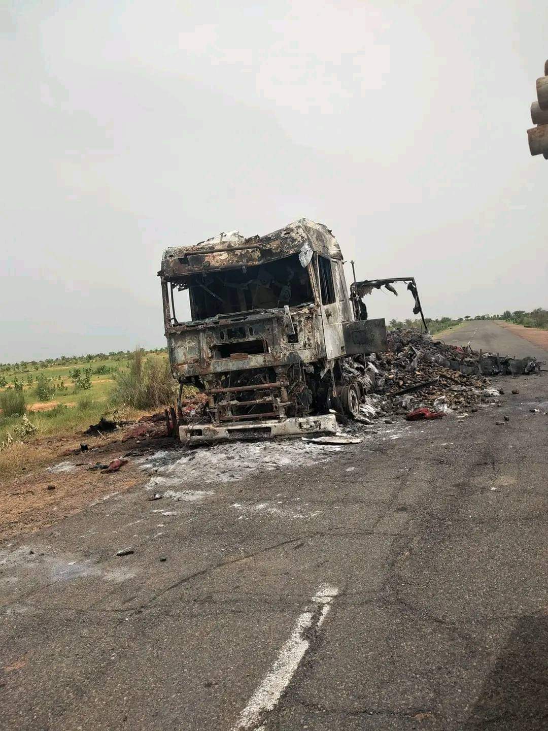 تداول نشطاء موريتانيون بالعالم الازرق فايسبوك صور توثق لشاحنة مغربية إلتهمت النيران بالكامل باقصى شرق موريتانيا على الطريق الرابطة بين مدينة كوبني ومدينة لعيون الموريتانية كانت وجهتها دولة مالي.