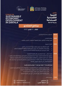 بشراكة مع جهة الداخلة وادي الذهب تحتضن عاصمة الجهة أشغال منتدى التنمية الاقتصادية المستدامة من تنظيم المعهد الجمهوري الدولي صباح يوم الثلاثاء 23 شتنبر 2025 بالمدرسة الوطنية للتجارة والتسيير وفق البرنامج التالي :